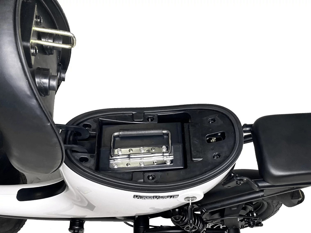 На рулевой стойке Kugoo V2 расположен вместительный бокс для транспортировки грузов весом до 50 кг. Каждый взрослый человек мечтает об электрическом самокате с возможностью перевозки личных вещей, продуктов из магазина, хозяйственных товаров. Данная модель предназначена для практичных людей. Также по центру размещен огромный яркий светодиодный фонарь.